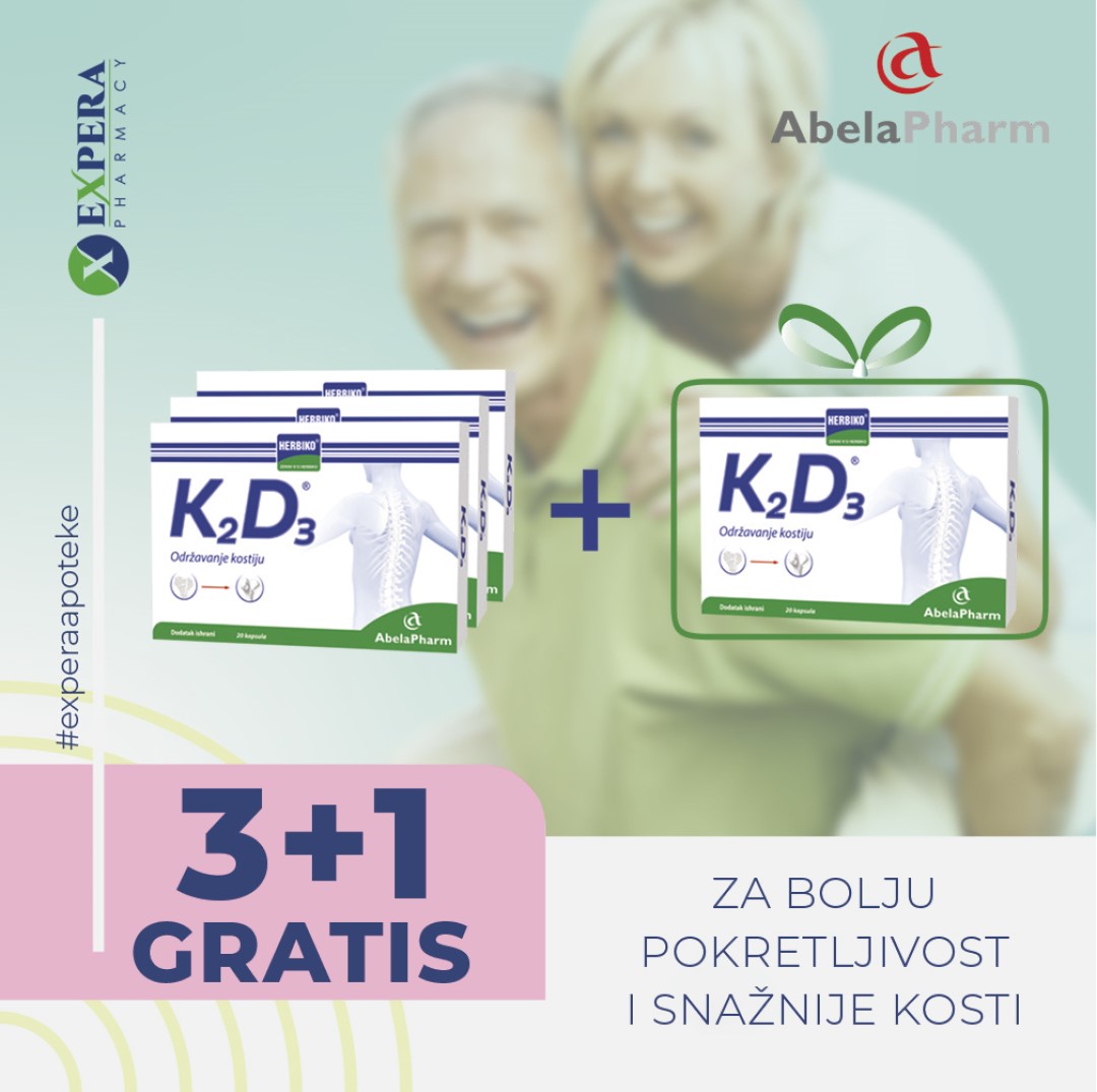 Detalji Objavljeno 12 mart 2023 12.03.2023. 09:21 Akcija 3+1 GRATIS na Herbiko K2D3 kapsule - za bolju pokretljivost i snažnije kosti