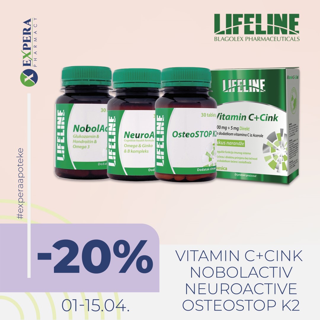 Detalji Objavljeno 03 april 2023 03.04.2023. 19:44 -20% na četiri Lifeline preparata: Vitamin C + Cink, Nobolactive, NeuroActive i Osteo STOP K2