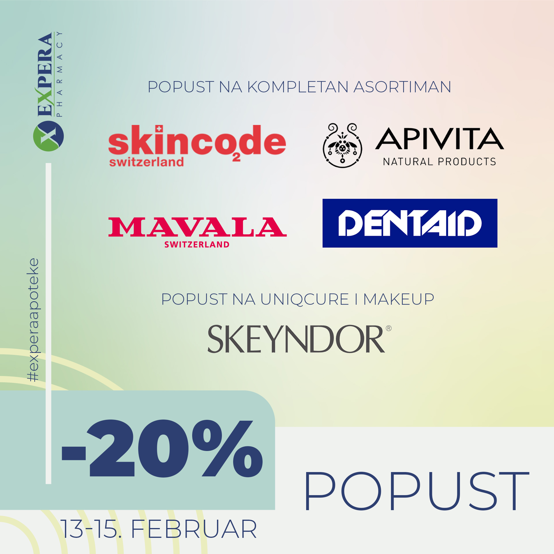 Detalji Objavljeno 13 februar 2023 13.02.2023. 08:09 Popust -20% na Skincode, Apivita, Skeyndor, Mavala i Dentaid