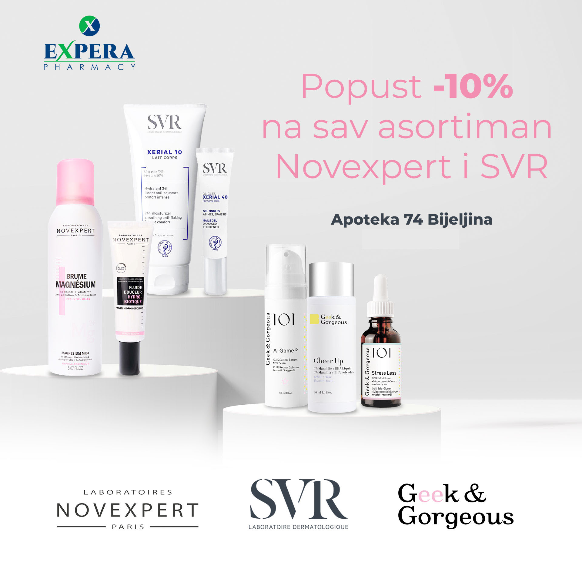 Detalji Objavljeno 08 septembar 2022 08.09.2022. 06:48 Dermobar Geek and Gorgeus, Novexpert i SVR uz -10% popusta na Novexpert i SVR /Apoteka br. 74/