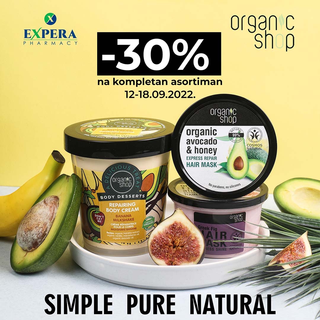 Detalji Objavljeno 09 septembar 2022 09.09.2022. 11:58 Popust -30% na kompletan Organic Shop asortiman, 12 - 18. septembar