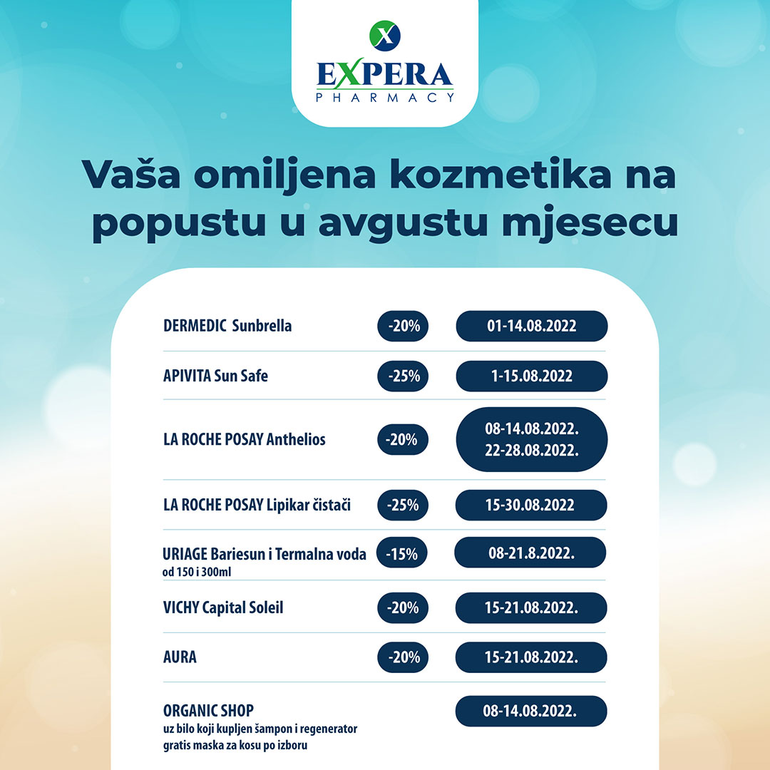 Detalji Objavljeno 04 avgust 2022 04.08.2022. 10:24 Popust -20% na kompletan Eucerin asortiman u tri Expera apoteke