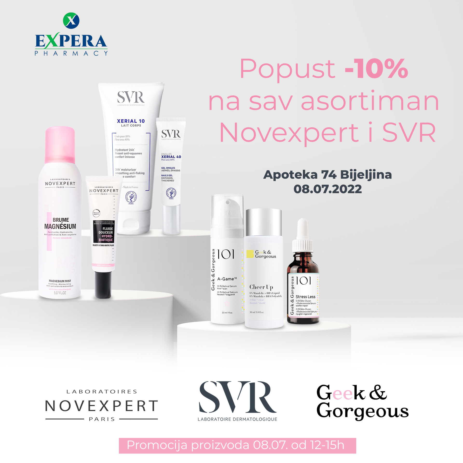 Detalji Objavljeno 07 jul 2022 07.07.2022. 07:56 Dermobar Geek and Gorgeus, Novexpert i SVR uz -10% popusta na Novexpert i SVR /Apoteka br. 74/